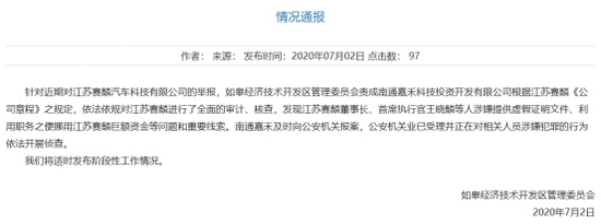 7月2日,如皋经济技术开发区管委会7月2日发布情况通报称:发现赛麟汽车董事长、首席执行官王晓麟等人涉嫌提供虚假证明文件、利用职务之便挪用江苏赛麟巨额资金等问题和重要线索,公安机关业已受理并正在对相关人员涉嫌犯罪的行为依法开展侦查。