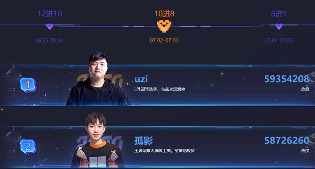 可以看到,目前两大热门主播可是UZI和孤影哦,两大粉丝团体也是真的很给力,双方的热度真的是不分上下了,有趣的是,刚好两个又分别是两大热门游戏的代表,一个LOL,一个王者荣耀,有意思了。
