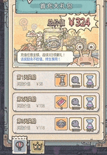 充值按钮:首充活动界面只是作为一个显示画面,并没有充值按钮,而是通过充值其他活动来达成首充条件。游戏中最低充值也需要几十元,并没有1元或6元充值,充值任意金额领取324元礼包也成了游戏吸引玩家付费的噱头而已。