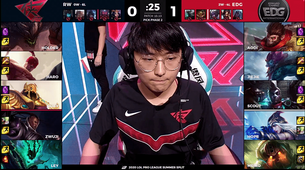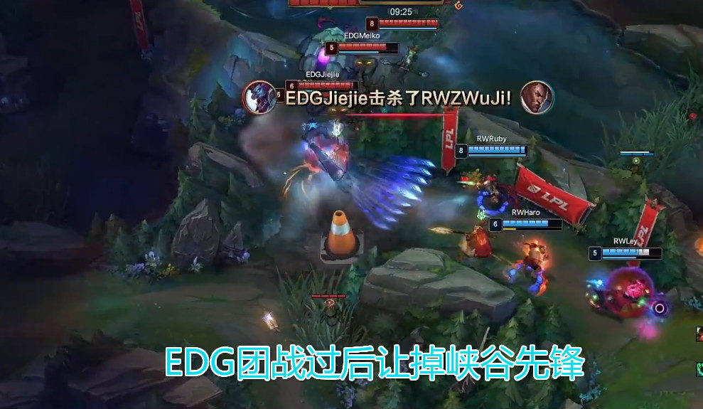 这场比赛RW有些病急乱投医,依然是选择了卢锡安走下路,不过也是没有让Hope再次拿到厄斐琉斯,所以下路的对决依然充满悬念,比较有意思的是RW上单位选出了石头人,这个英雄目前在LPL的胜率低得可怜,RW再次选出有些欠考虑,而且EDG的阵容不是很怕这个英雄,巨魔大招一开石头人基本上形同虚设,除非可以打出那种大招击飞四人以上的操作,否则的话 效果也许不如一个塞恩;9分钟双方峡谷先锋处爆发团战,EDG打出一换一之后被迫撤退,先锋也是让给了RW。