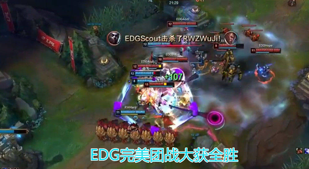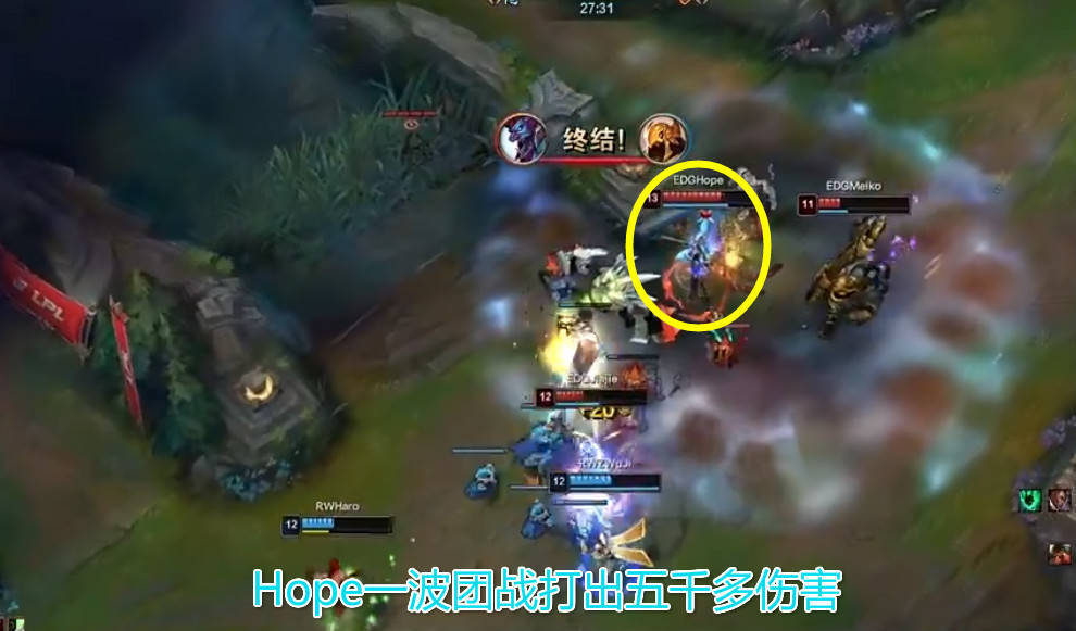 不过这么好的机会EDG并没有选择拿大龙,一顿拉扯之下反而是状态太差被击退,其实虽然EDG团战打得很漂亮,但是经济差距一直没有拉开,甚至RW还有一点小领先,而且团战也是出于强势期,石头人加上沙皇还有盲僧和锤石四个人的击飞还是令人头痛,Aodi进场基本上很难发挥到作用,27分钟双方中路再次开团,EDG虽然小学弟被秒,但是通过拉扯Hope不停的输出,成功的将RW给团灭。