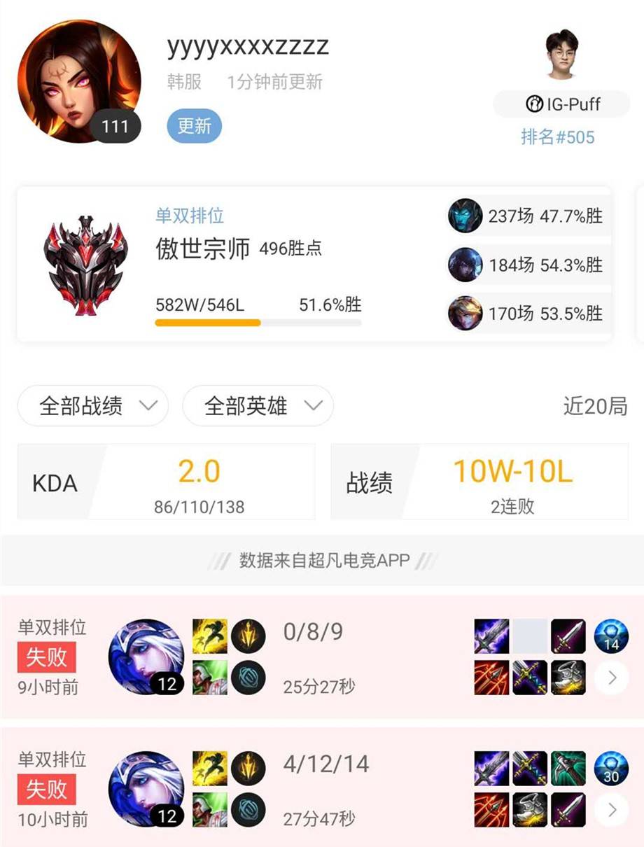 与此同时,IG战队惨败给JDG战队之后,Puff和凛酱Reheal也在赛后开启了双排,而在两局排位中,Puff也是连续选出了寒冰,但是,最终都以失败告终了,在第一局排位中,Puff使用寒冰打出了4-12-14的战绩,而Reheal则是使用卡尔玛打出了6-9-14的战绩,而在第二局排位中,Puff再次使用寒冰,却打出了0-8-9的战绩,而Reheal则是使用塔姆打出了0-10-8的战绩,从中也可以看出,Puff和Reheal的双排战绩也不理想呀!