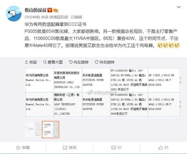 根据数码博主的消息,华为的两个电源适配器已通过3C认证,一个是65W GaN,另一个可能是为Mate 40系列准备的66W充电器。