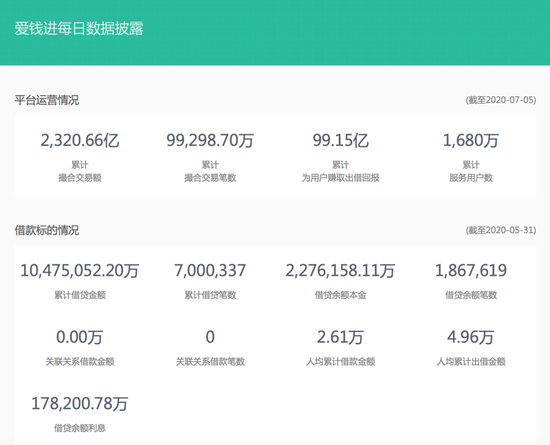 据21世纪经济报道,爱钱进官网披露,截至2020年7月5日,爱钱进借贷余额本金约227.6亿元,当前出借人数量约37.6万人。