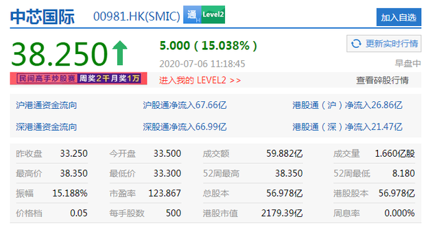 7月6日上午消息,中芯国际涨幅扩大至15%,盘中股价续刷历史新高。截至发稿,中芯国际涨15%%报38.25港元,市值2179.39亿港元。