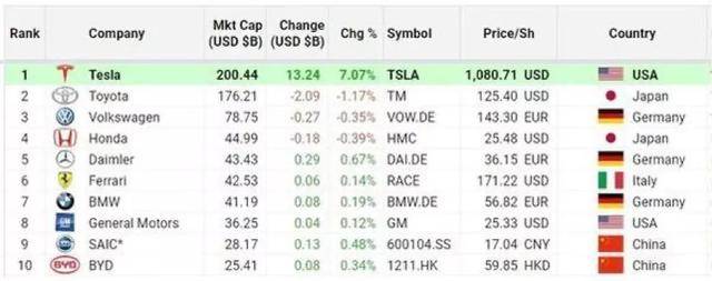 美东时间6月30日,特斯拉股价上涨6.98%至1079美元,市值突破2000亿美元,相当于1.1个丰田、4.7个法拉利、8个福特、22个蔚来。上市十年以来,特斯拉股价上涨44倍,成为目前全球最炙手可热的新能源汽车巨头。