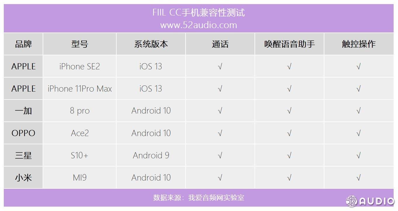 我爱音频网采用6款手机与 FIIL CC 进行连接兼容性测试,采用手机分别是:iPhone SE2、iPhone 11Pro Max、一加8Pro、OPPO Ace2、三星S10+ 和小米9。数据如图所示,通过与图中手机产品连接,然后测试FIIL CC在这几款产品上的使用情况,测得各项功能都能够正常使用。