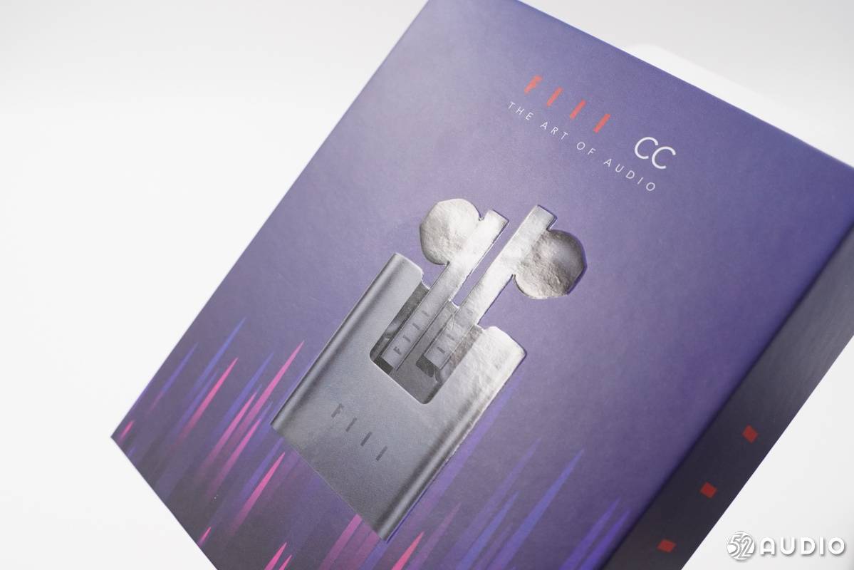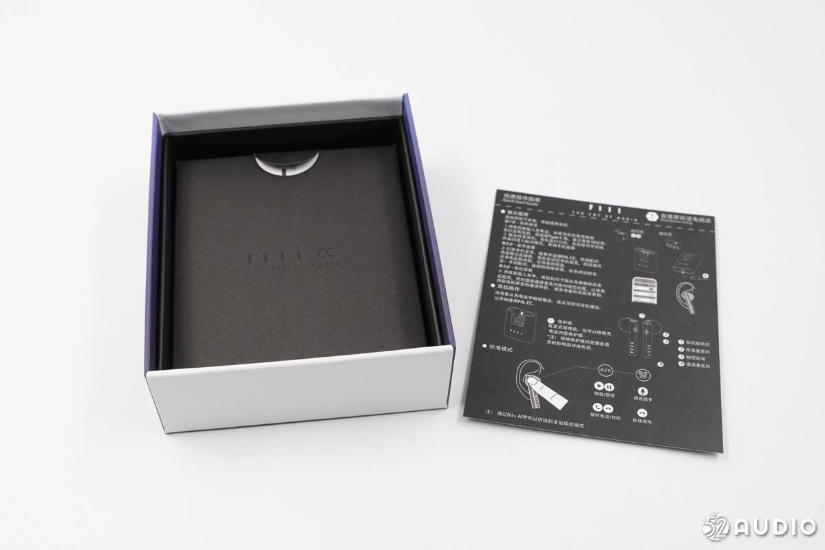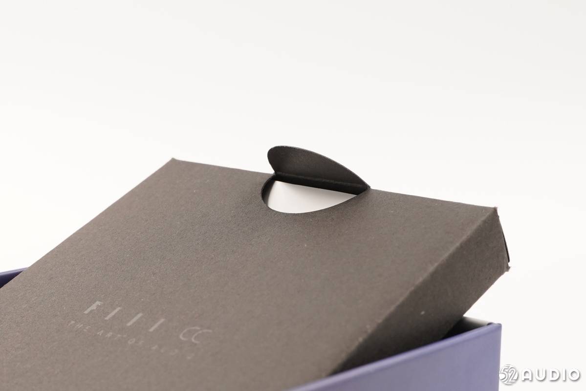 卡片下还有一个包装盒,正面印有FIIL CC、THE ART OF AUDIO的黑色亮面字体。