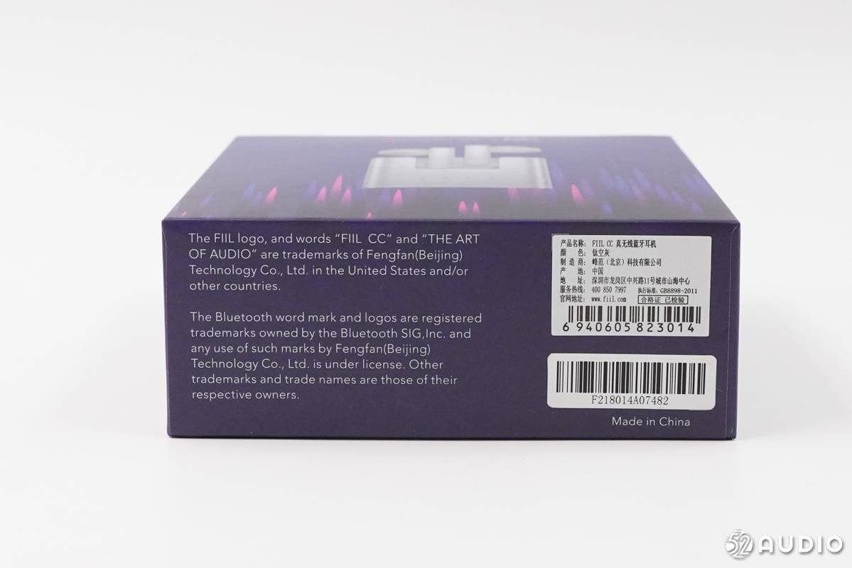 底面为英文的商标信息。白色贴纸有产品名称:FIIL CC真无线蓝牙耳机、颜色:钛空灰、制造商:锋范科技有限公司等产品信息。