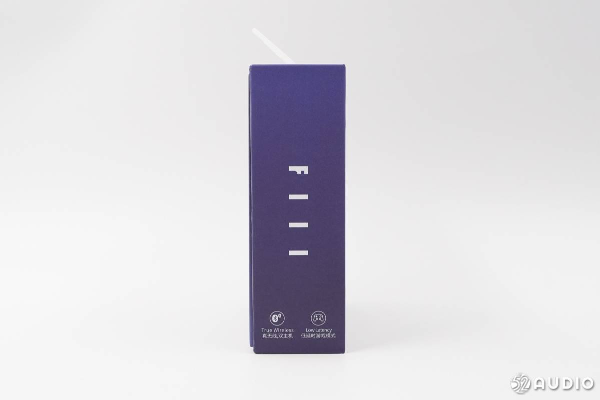 左侧面有白色字体FIIL品牌LOGO和真无线双主机、低延时游戏模式两个产品特点。