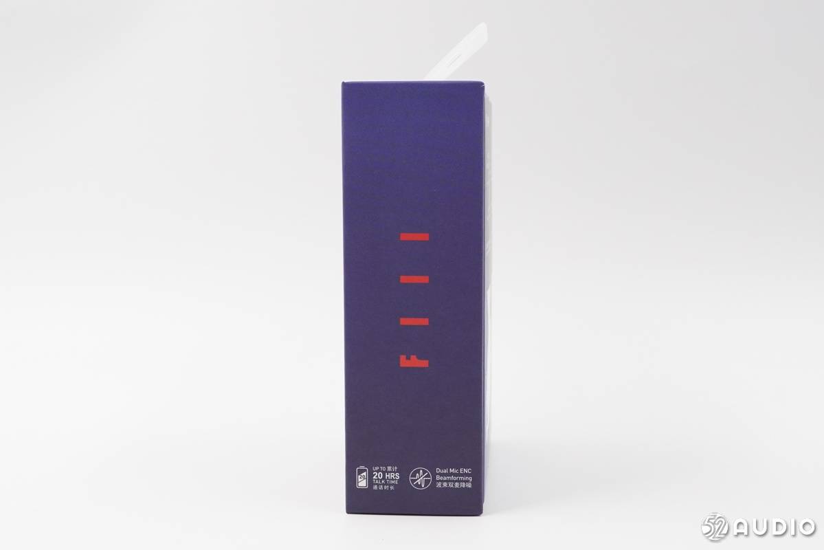 右侧面为红色FIIL品牌LOGO和通话时长以及波束双脉降噪两个特点。