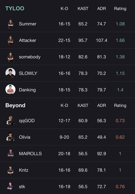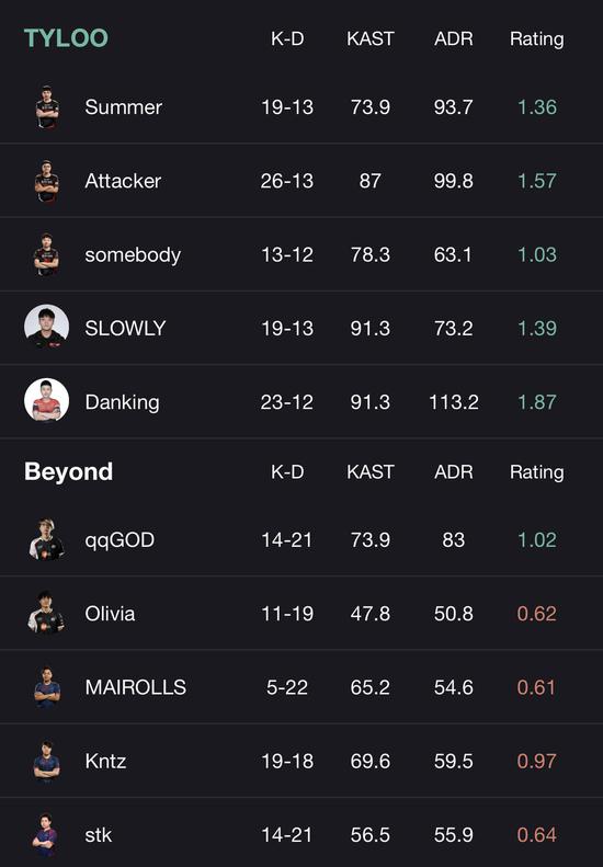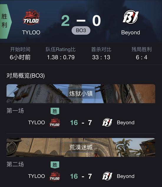 TYLOO对阵Beyond 图一Inferno,上半场开局TYLOO在防守方稳扎稳打,连续取得六分,并在半场结束时以11:4保持住了领先优势。下半场开局Beyond虽然通过拆除炸弹取得两分,但随后TYLOO凶猛的公司让Beyond措手不及,最终TYLOO以16:7赢下图一。