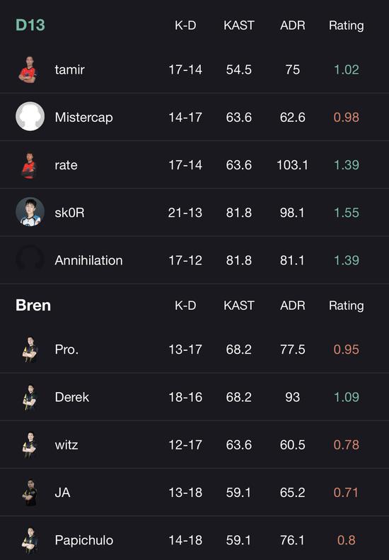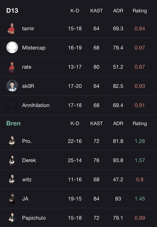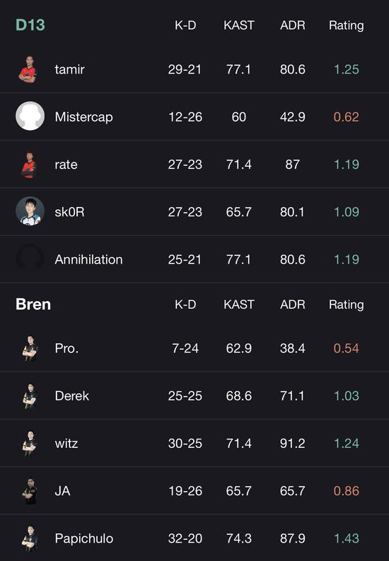 D13对阵Bren 图三Nuke,上半时D13赢下手枪局后,作为CT方的Bren扳平后请求暂停调整状态,但效果甚微,上半场D13 8:7 Bren。下半场开局D13率先夺得五分,但随后Bren开始回追并成功将比赛拖入加时。但加时赛的Bren还是不低D13,以16:19告负。最终D13以2:1的大比分获得胜利。