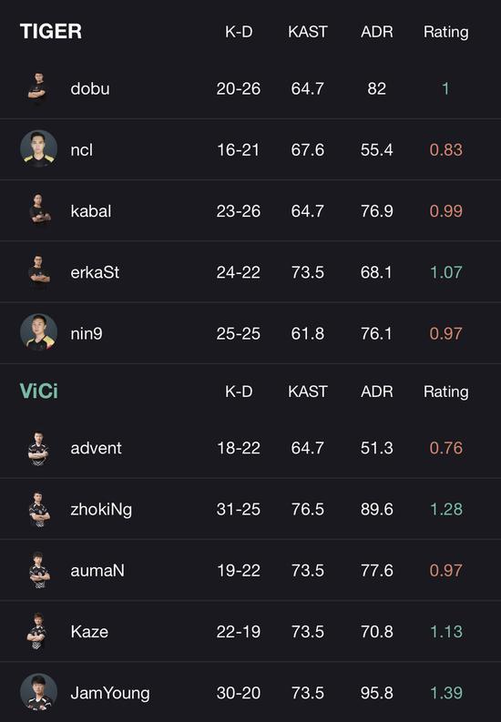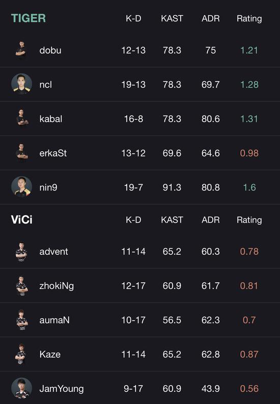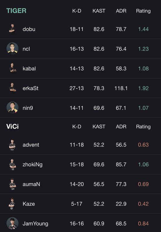 Tiger对阵VG 图二Mirage,作为防守方的VG首先拿下三分,但凭借erkaSt的个人能力,上半场Tiger取得了9:6的领先优势。下半场开局,防守端的erkaSt和dobu表现亮眼,Tiger队员及时的补枪也让他们以16:7拿下了图二。