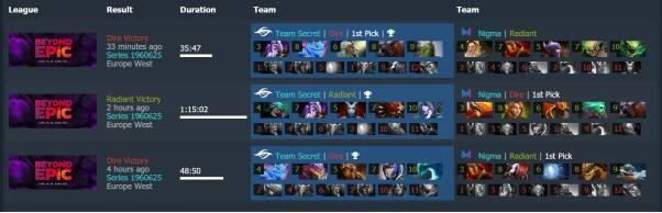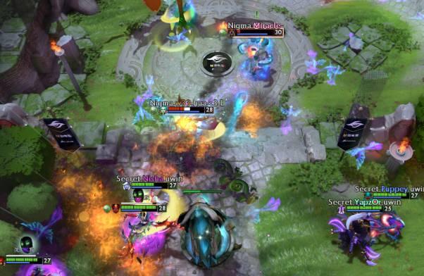 那么问题来了,那么早就完成破路,为什么比赛会一直打到75分钟才结束呢?关于这个问题,恐怕只有在场的十名选手能够回答。在屏幕另一侧的观众所目睹的画面是,Nigma送一个、秘密再送一个;Nigma买一个,秘密再买一个。两边都没有结束比赛的想法,直到黑弓和女王买出圣剑,秘密才产生了和Nigma决一死战的打算。那波高地团战开打前,因为拍拍熊无限控盾,掌控地图的Nigma经济领先两万五千块。只可惜,带着血魔BUFF的圣剑黑弓输出太高,Nigma一直都推不掉秘密的高地——推不掉能撤走就算了,最难受的撤也撤不走!一波团战,Nigma被黑弓反杀了三名英雄!为了击杀黑弓,Nigma付出了五名英雄的惨痛代价。