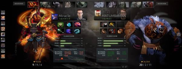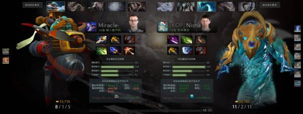 至于BO5剩下的两把,第一局是Nisha的水人翻盘秀。虽然Nigma在前期取得了不小的经济领先,但他们未能压制住水人的发育。拿下三代肉山,吃下A杖卷轴,变身牛头开E,捡到双倍神符——水人的面板伤害到达了惊人的2300。一般,我们只会用两个字来形容这样的水人——“水怪”!在Nigma的高地上,Nisha为所欲为!奇迹哥的圣剑飞机对水人无法形成任何威胁,没等飞机发力,他的队友已经被水人全部消灭。当着奇迹哥的面拆基地,Nisha做到了!