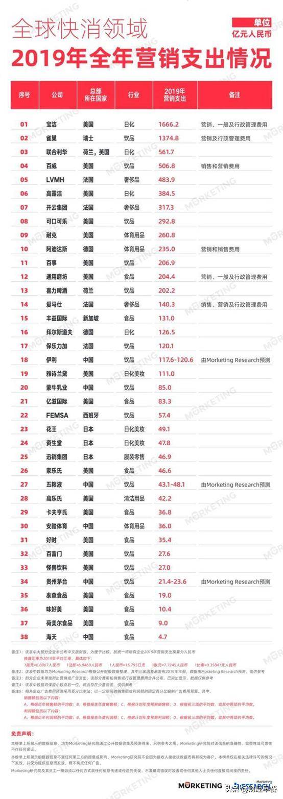 在2019年,这38家企业几乎花费了近8000亿元用于广告营销。而仅宝洁和雀巢两家的营销花费就接近3000亿元,超过38家企业营销预算总额的三分之一。