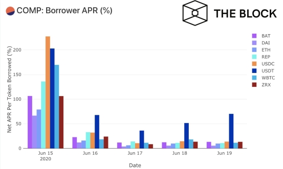 如果说COMP价格的暴涨已经足够吸引投资者的眼球,那么COMP分发机制就进一步打开了套利空间,吸引了大量的挖矿套利者疯狂涌入。我们都知道,在COMP分发机制中,所有使用Compound 存款和借贷的用户都能按规则分到COMP,对于投机者而言,搬砖套利收益是实打实的。据The Block报道,自6月15日以来,COMP利率有所下降,当时USDC和USDT的年化收益率都在200%以上,不过借USDT的年化收益率仍然超过50%。