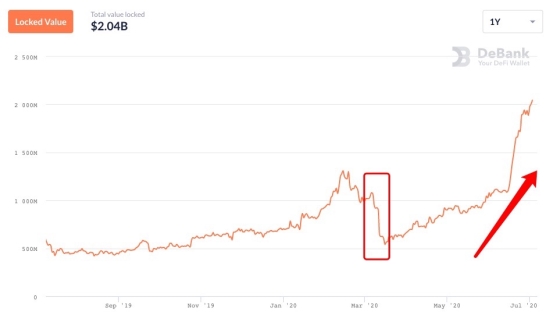 截至7月3日,DeFiMarketCap数据显示,DeFi(去中心化金融)代币前百的总市值超过64.2亿美元。同时,据DeBank数据,DeFi生态质押资产总价值为20.4亿美元。要知道,在“312”暴跌时,各个DeFi平台清仓清算机制一度崩溃、以太坊网络严重拥堵、很多抵押ETH的资产被强制清算、流动性枯竭以及0 DAI清算借款人抵押资产等乌龙事件,使得DeFi锁仓市值直接腰斩,DeFi 生态顿时陷入一片暗淡,岌岌可危。