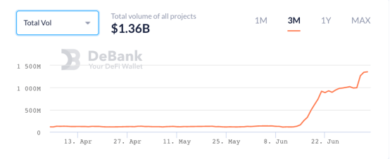 同时,DeBank数据显示,Compound的资金规模已达13.6亿美元,一个月内上涨了超10倍。其中,Compound平台总锁仓量为6.16亿美元,借款总量为7.35亿美元。