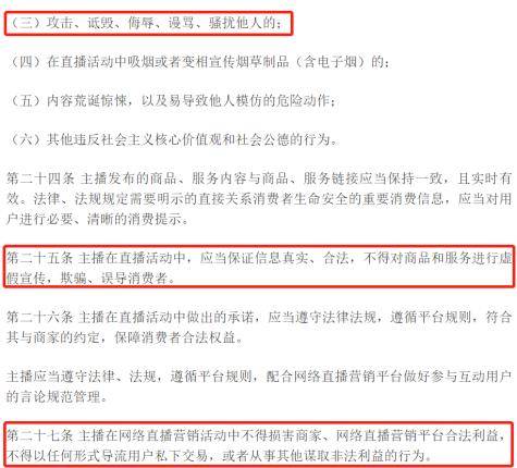 《规范》第六条、二十三条、二十五条、二十七条等明确提出,网络直播营销主体不得利用刷单、炒信等流量造假方式虚构或篡改交易数据和用户评价;不得进行虚假或者引人误解的商业宣传,欺骗、误导消费者;主播在直播营销中不得含有攻击、诋毁、侮辱、谩骂、骚扰他人等行为。