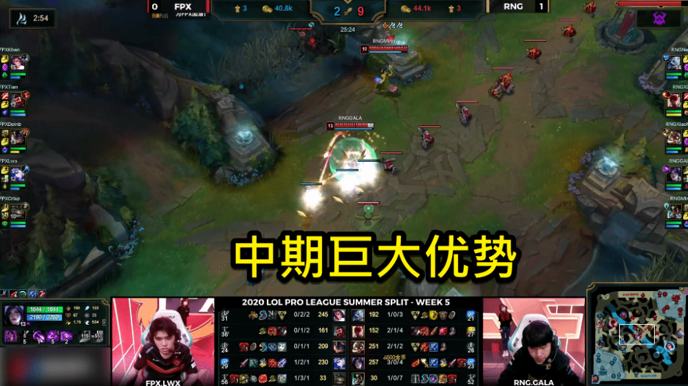 第二局游戏就非常跌宕起伏了,双方的阵容其实都非常偏向于后期,但RNG可以说是完美开局,FPX几次下路四包二都被完美破解,反而是FPX战队送出了大量人头,中立资源也被RNG战队控了下来,游戏中期的时候,Gala的装备已经是非常豪华了,更何况越往后拖RNG的阵容越强,似乎已经是稳操胜券,要爆冷击败FPX证明自己。