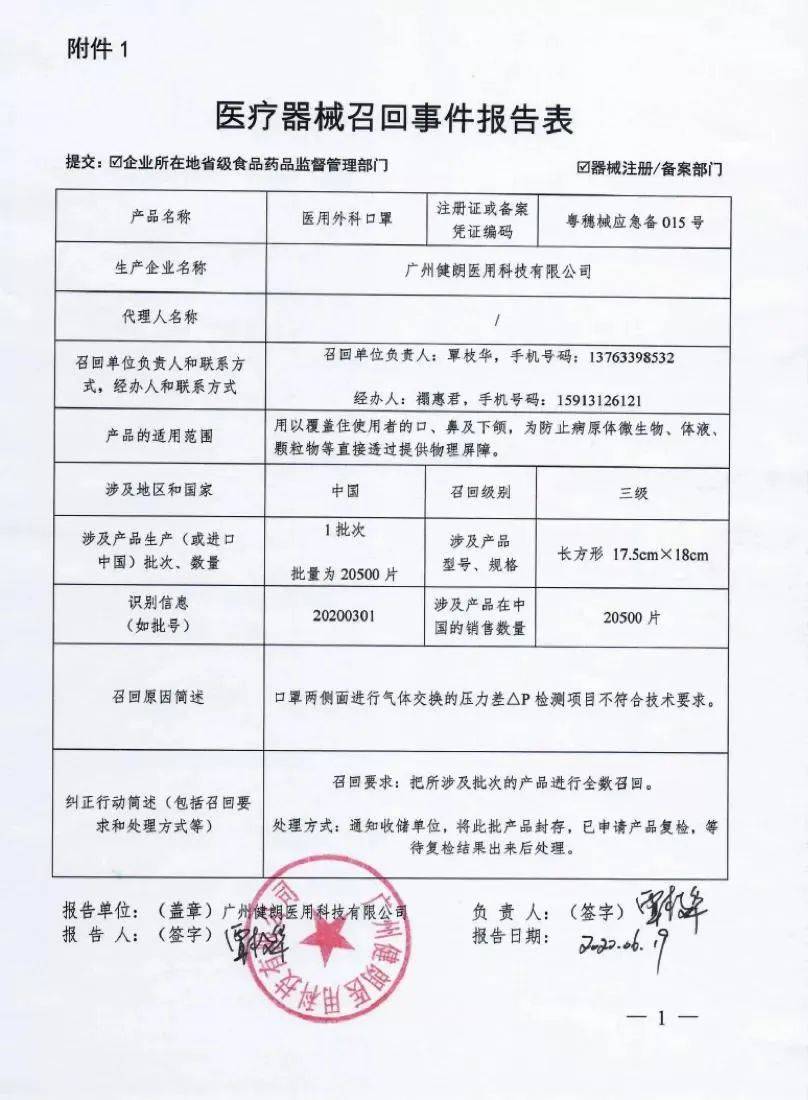 广州健朗医用科技有限公司报告,该公司对其生产的医用外科口罩实施主动召回处理,召回级别为三级,涉及产品的型号、规格及批次等详细信息见《医疗器械召回事件报告表》。