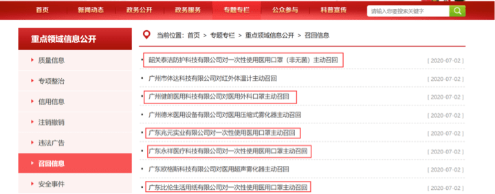 7月2日,广东省药品监督管理局官网发布多则口罩召回信息,涉及5家公司,总量超过10万只。 分别为韶关泰洁防护科技有限公司、广州健朗医用科技有限公司、广东兆元实业有限公司、广东永祥医疗科技有限公司、广东比伦生活用纸有限公司。