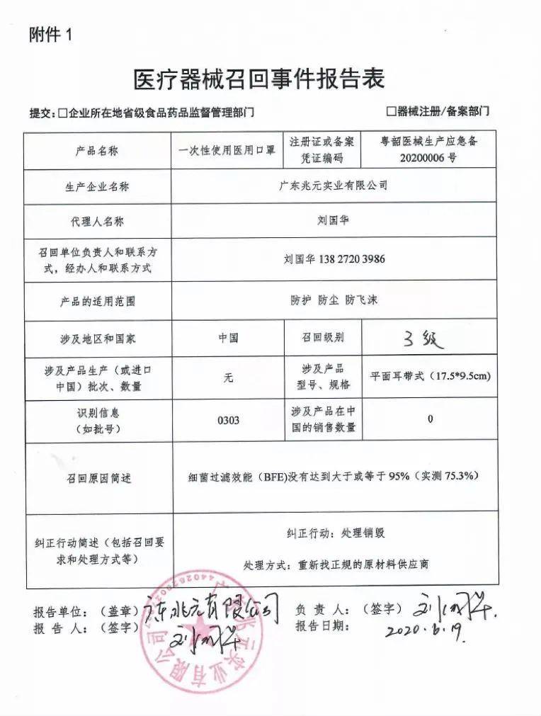 广东兆元实业有限公司报告,该公司对其生产的一次性使用医用口罩实施主动召回处理,召回级别为三级,涉及产品的型号、规格及批次等详细信息见《医疗器械召回事件报告表》。