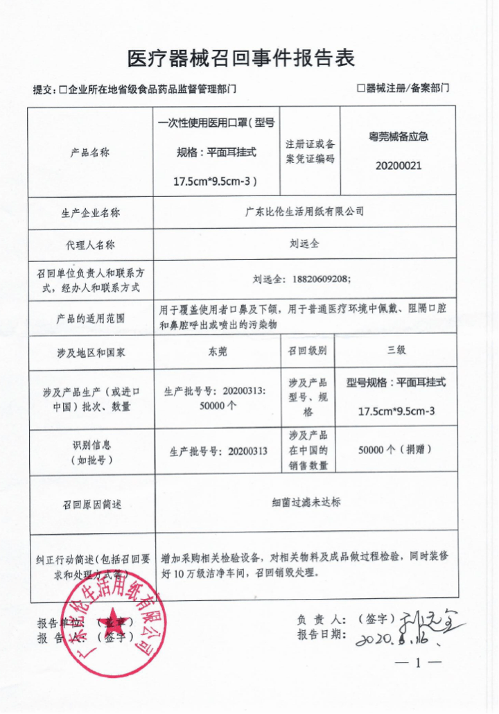 广东比伦生活用纸有限公司报告,该公司对其生产的一次性使用医用口罩实施主动召回处理,召回级别为三级,涉及产品的型号、规格及批次等详细信息见《医疗器械召回事件报告表》。