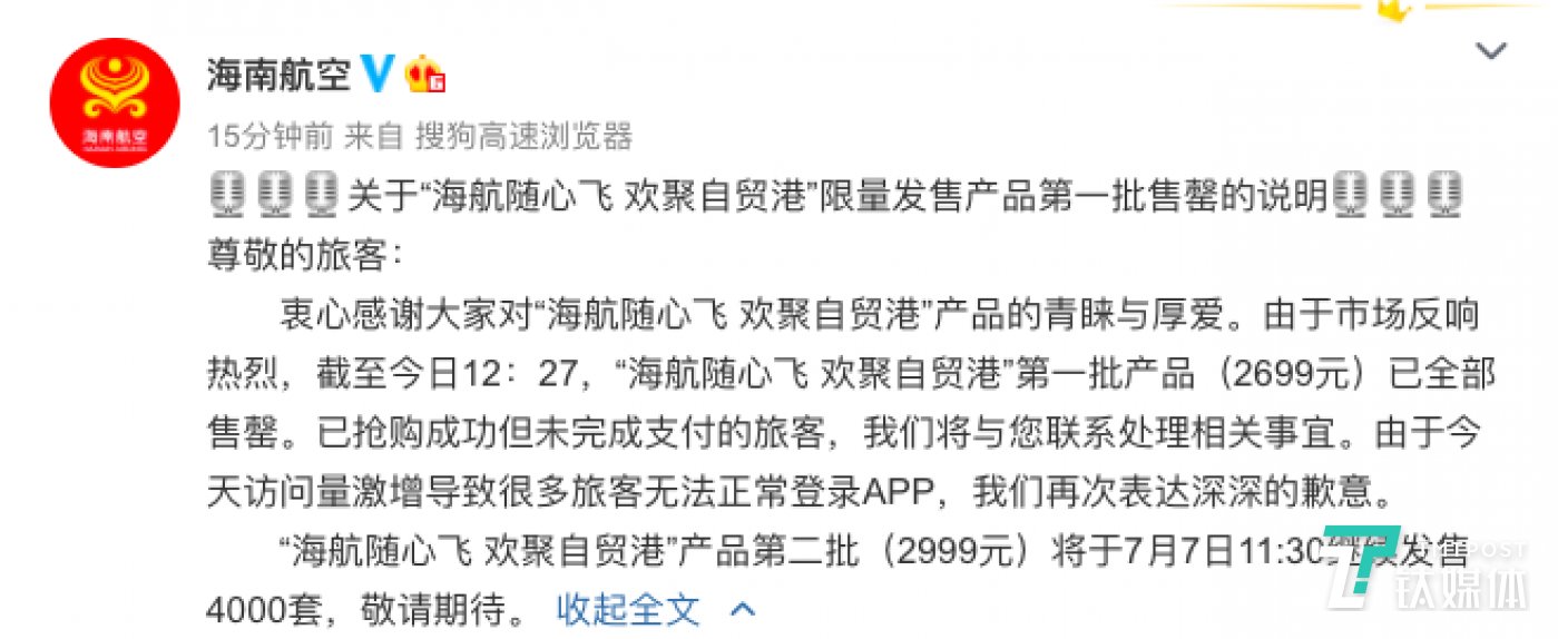 据悉,截至今日12:27,“海航随心飞 欢聚自贸港”第一批产品(2699元)已全部售罄。“海航随心飞 欢聚自贸港”产品第二批(2999元)将于7月7日11:30继续发售4000套。