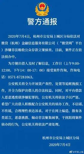 7月4日深夜,杭州市公安局上城分局发布立案通报,依法对“微贷网”涉嫌非法吸收公众存款立案侦查,并表示案件正在侦办中。之后警方还在官方微博发文,敦促微贷网尚未还款的借款人归还借款。意味着公安机关在对平台立案侦查后,也接手了对平台借款人恶意逃废债的追责工作。