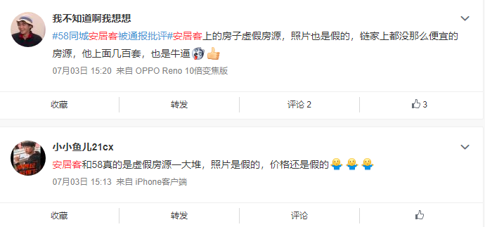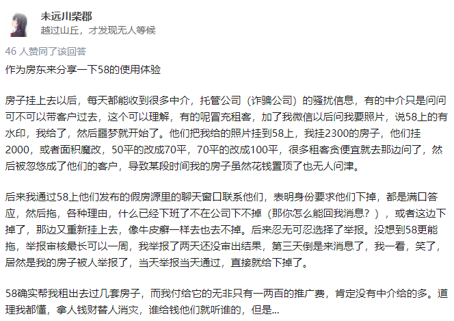 知乎网友普遍反映,58同城和安居客个人房源较少,大部分活跃的是经纪人。他们通常利用低价钓鱼房源引流,待用户致电时再介绍其他房源。