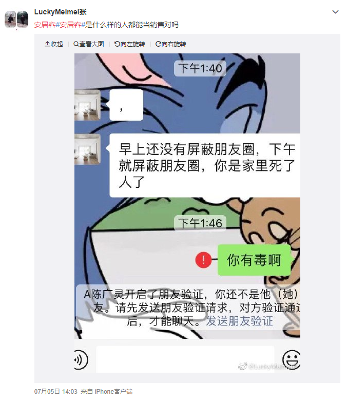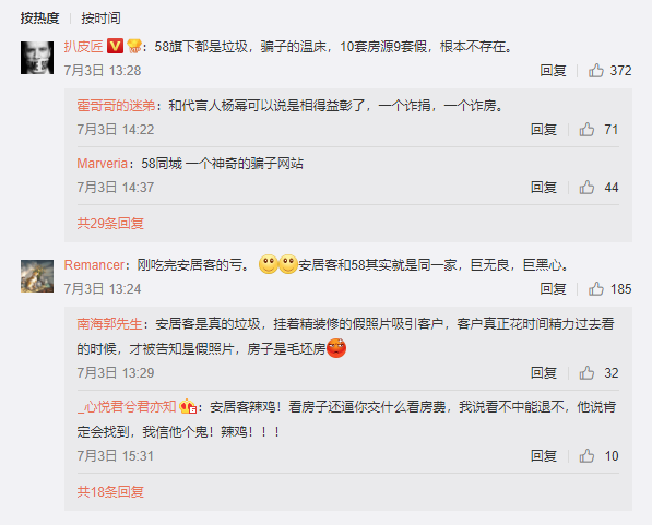 除了发布内容问题,58平台上的经纪人素质良莠不齐,微博网友@LuckyMeimei张称,平台经纪人态度恶劣,辱骂用户。这并非个例,记者在黑猫投诉中发现,有用户因安居客房源的在线咨询人态度恶劣给予差评,经纪人便打电话骚扰,发短信辱骂,并扬言要到用户公司找麻烦。