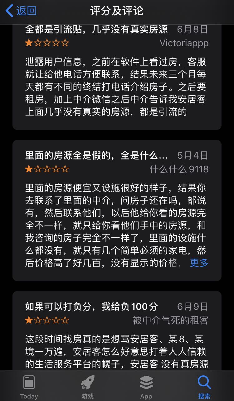 在黑猫投诉中搜索“58 房源”,出现490条投诉,安居客的投诉量为278条,不乏对虚假房源、涉嫌泄露用户隐私信息、乱扣保证金等问题的投诉。与此同时,在苹果App Store应用商店中,对于安居客软件的评价也多为虚假房源问题。