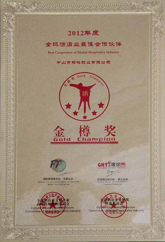 图为“2012年度全球酒店业最佳合作伙伴-金樽奖”