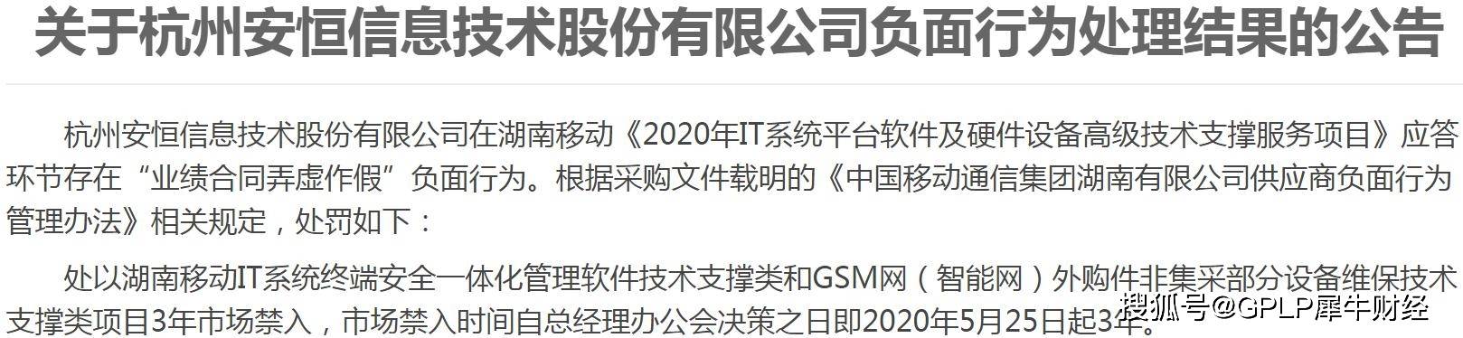 原标题:格力电器之后安恒信息被中国移动3年市场禁入 回应称合作伙伴所致