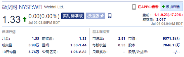7月6日下午消息,微贷网(WEI.N)盘前跌超17%。