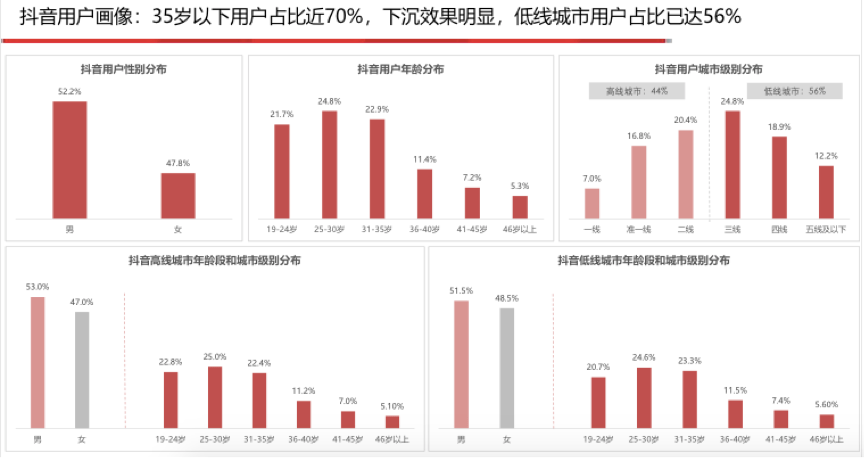 很多人说,因为快手的用户更加下沉,2019年的数据显示,快手70%的用户是三线及以下用户,不过,抖音的用户下沉,也挺到底的,56%的用户分布在三线及以下市场:
