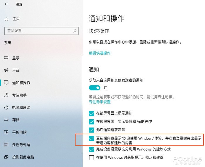 有时 Win10 更新完成后,会弹出一个蓝色欢迎框。如果实在不喜欢这东东,只要打开 “设置 - 系统 - 通知和操作”,将右侧的 “更新后向我显示‘欢迎使用 Windows‘体验,并在我登录时突出显示新增内容和建议的内容’”取消即可。下一次升级,就不会再看到这个提示了。