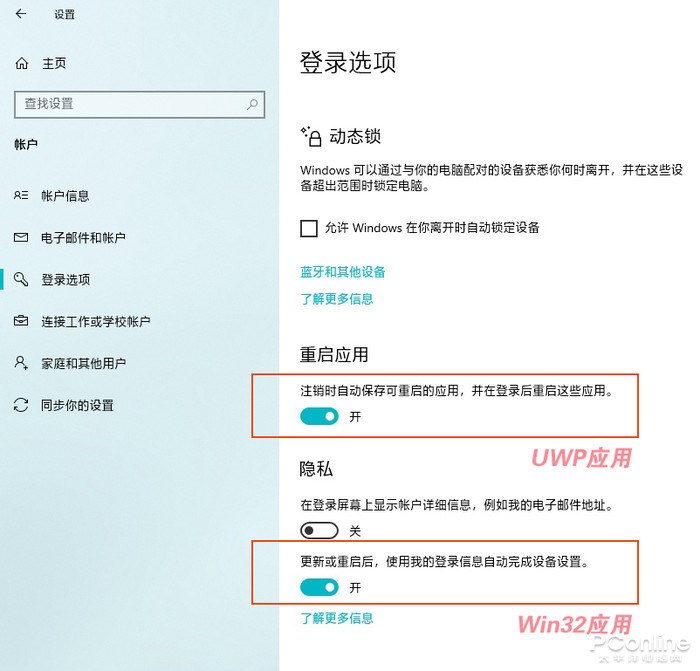 打开 “设置 - 账户 - 登录选项”,将右侧面板滑至最下方,将 “注销时自动保存可重启的应用,并在登录后重启这些应用”、“更新或重启后,使用我的登录信息自动完成设备设置”两个选项关闭,即可解决开机跳软件问题。其中 “注销时自动保存可重启的应用,并在登录后重启这些应用”的作用是自动启动上一次未关闭的 UWP 应用,“更新或重启后,使用我的登录信息自动完成设备设置”的作用是自动启动上一次未关闭的 Win32 应用。