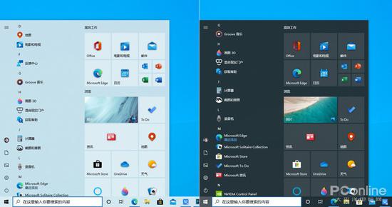 类似的变化也出现在平板模式下,磁贴能够根据系统主题自动切换,程序清单也取消了底色设计。