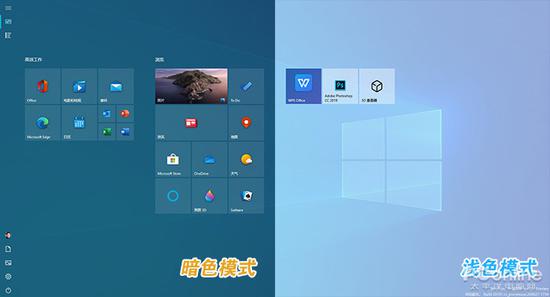 除了标准的浅色和深色外,新版开始菜单同样支持主题换色。更换方法与现版一样,打开“设置-个性化-颜色”,将颜色模式修改为“自定义”,然后再将“选择你的默认Windows模式”改为“深色”。接下来挑选一款你喜欢的颜色,勾选最下方的“在下列区域显示主题色:‘开始’菜单、任务栏和操作中心”,片刻后开始菜单就焕然一新了。