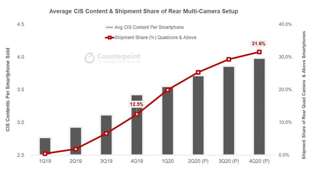 最近来自调研机构 Counterpoint 的一份报告显示,今年一季度出货的智能手机平均配备了 3.5 颗镜头,其中四摄手机已经占据总出货量的 20%,Counterpoint 预测到今年末这个数字会增长到 31.6%。