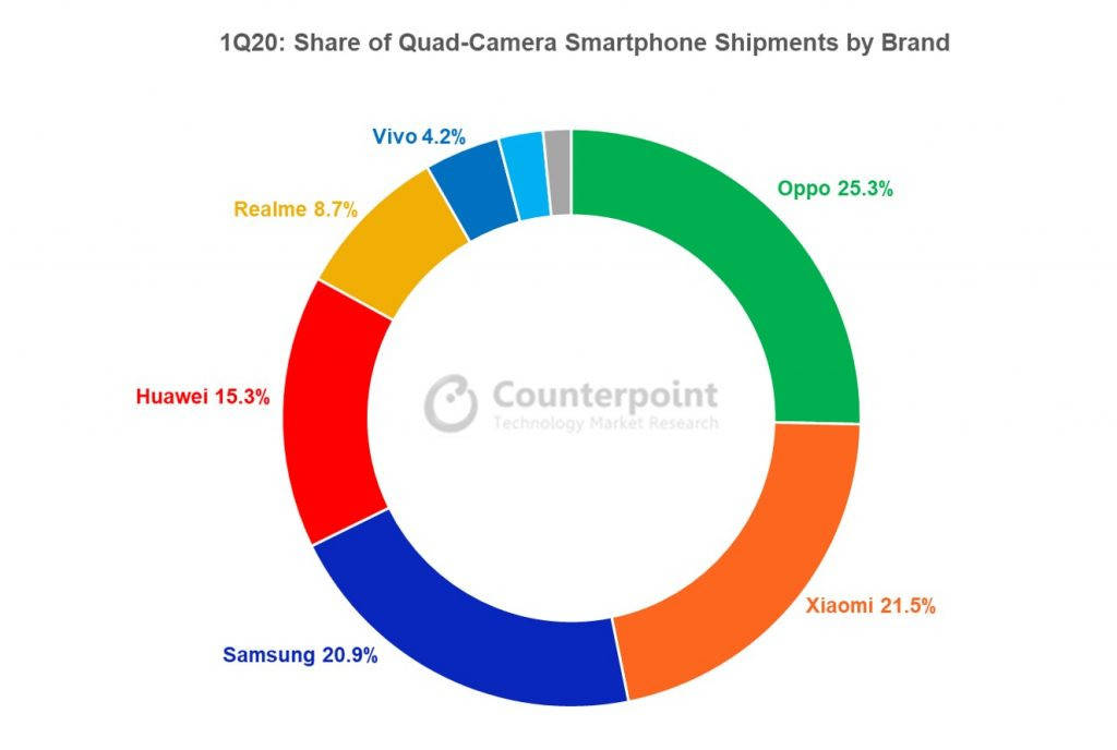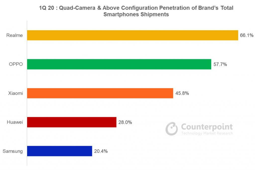 那么哪些厂商最热衷于堆镜头呢?Counterpoint 统计的数据显示,在一季度所有出货的搭载四摄及五摄的手机中,OPPO、小米、三星和华为的占比位列前四,合计份额达到 83%。而 realme 虽然只占 8.7%,但四摄手机在该品牌出货的手机中占了 66.1%,OPPO 出货的手机中也有 57.7% 的四摄手机,其后则是小米、华为和三星。