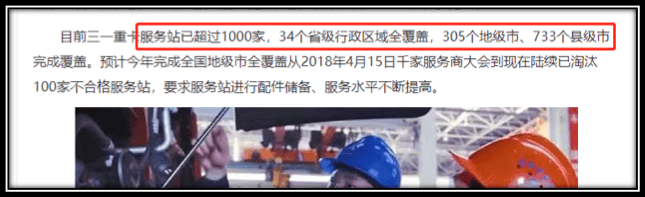 由于重卡用户大多从事长途物流运输,服务网点的健全与否,直接关系到卡友的运营效益。据该重卡企业报道,2018年已实现了“服务站1000家,34省级行政区域全覆盖,305个地级市、733个县级市覆盖”。(详见下图)