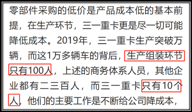 我们熟知的一般人员架构中,一个重卡企业大概分为研发、设计、制造、管理、营销、采购、财务、人力行政、服务9个模块。其中,财务、人力行政、管理等3个方面的人员比例较为固定,每项比例基本为整体的5%-8%,按5%计算的话,三者总和大概有45人。也就是说不到150人将承担研发、设计、营销、服务四个重要模块的工作。