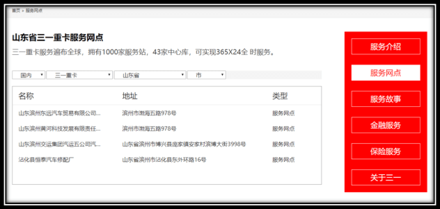 截图为某湖南重卡官网查询“山东省服务网点”查询结果