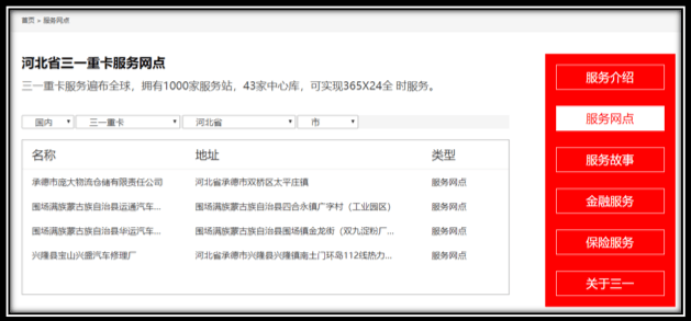 截图为某湖南重卡官网查询“河北省服务网点”查询结果