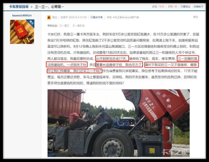 类似“打太极”推脱服务的事情,也发生在山东枣庄的卡友身上。据介绍,该卡友的车在9万公里时发现缸垫漏水,在更换完缸垫跑了2千公里后,发动机报废。最后经过协商,17天后完成总成更换,但“因为没换基础机,一点损失不补”。甚至该卡友介绍,该品牌董事长给出了“潍柴不给,我也尽力了”的回复。如此推脱,也让该卡友非常不满,“我买的是XX又不是潍柴,哪里坏让我们找哪里,我还买XX干吗”。由于自身产品质量不过关、服务推脱责任,该重卡品牌不仅不承担用户损失,还直接对该卡友造成了“17天无法营运”的损失。究竟是自身服务完全依靠供应商承担,还是压根就对用户利益不管不顾?